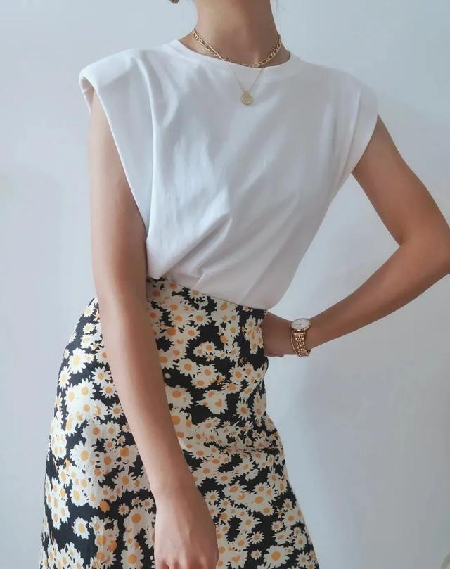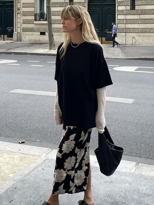 宽松白T+碎花迷笛裙